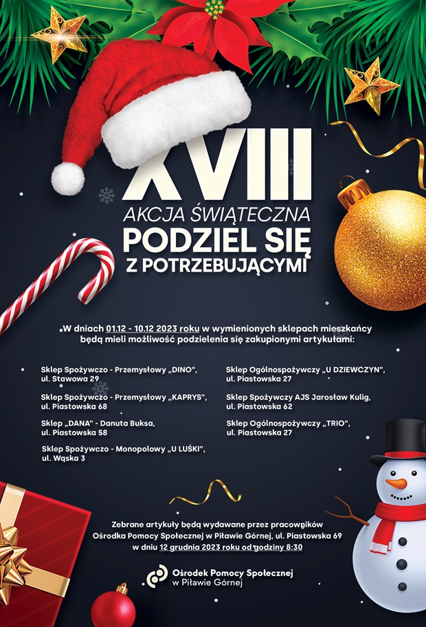 Rusza kolejna edycja lokalnej akcji charytatywnej „Podziel się z potrzebującymi”. W dniach od 1 grudnia 2023 roku do 10 grudnia 2023 roku Mieszkańcy Piławy Górnej w wielu sklepach na terenie miasta będą mogli podzielić się zakupionymi artykułami. Zachęcamy do wsparcia akcji. Wystarczy, że z naszych zakupów włożymy do wystawionego pudełka tylko jedną rzecz.